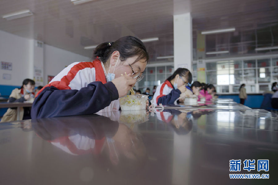 3月14日,海北州第一高級中學(xué)學(xué)生在餐廳分桌就餐。新華社 吳剛 攝