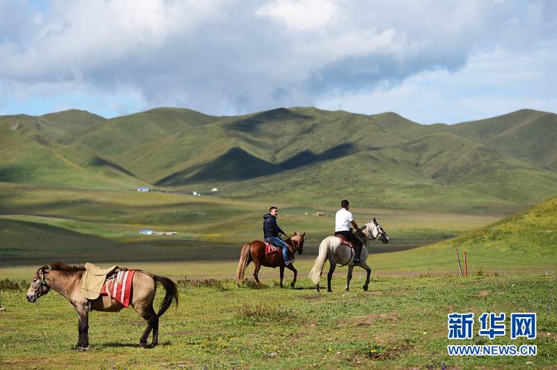 2019年8月13日,游客在甘南藏族自治州碌曲縣尕海鎮(zhèn)尕秀村草原上騎馬。新華社記者 趙丁喆 攝