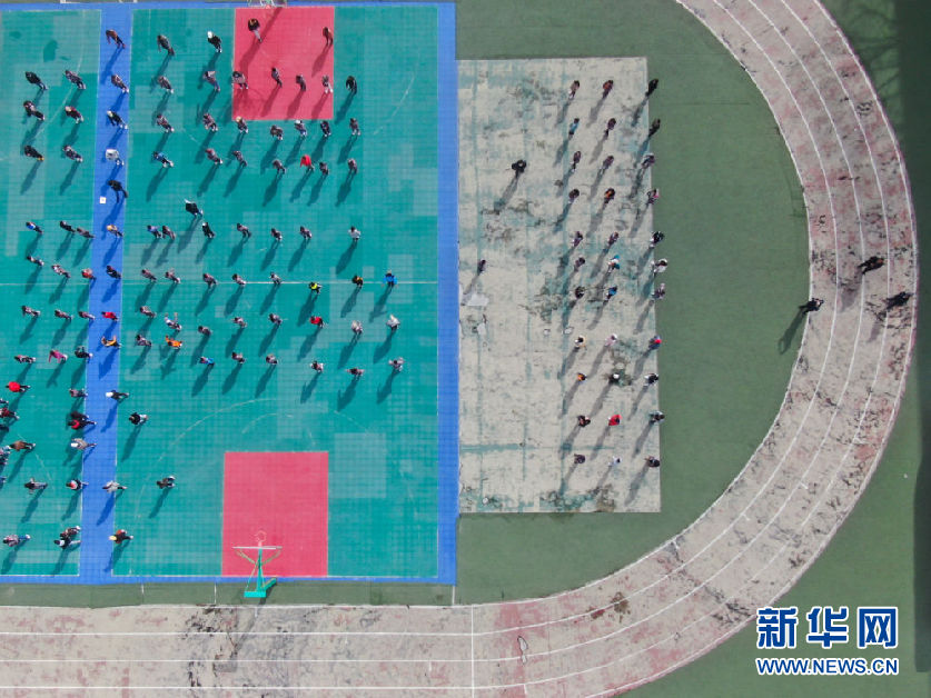 在青海省玉樹(shù)藏族自治州八一孤兒學(xué)校,學(xué)生們?cè)谶M(jìn)行課間活動(dòng)(4月3日攝,無(wú)人機(jī)照片)。新華社記者 張龍 攝