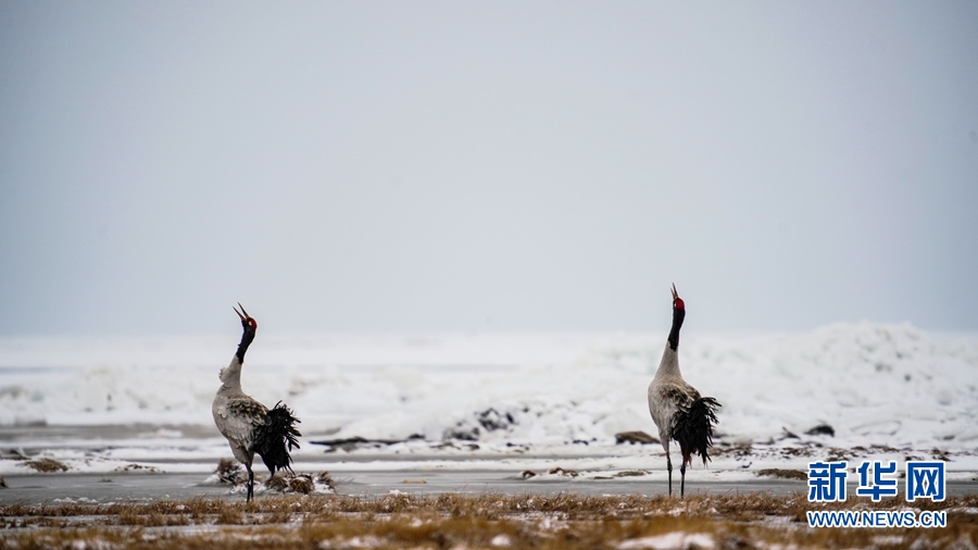 4月17日,受冷空氣影響,青海省海北藏族自治州剛察縣迎來一場春雪,兩只雪域“精靈”黑頸鶴在青海湖仙女灣景區(qū)“與雪共舞”,上演青海湖畔最美“雪中情”。