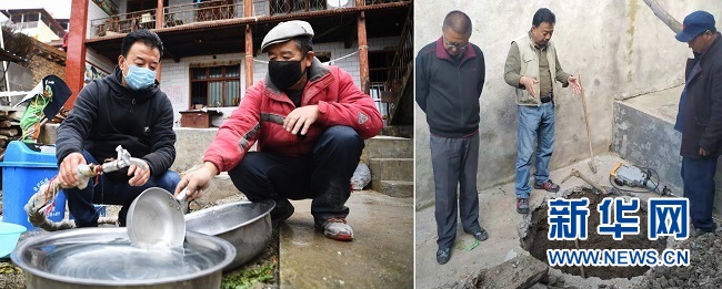拼版照片:左圖為4月21日,勒阿村駐村第一書記張金利(左)在村民屠海榮家查看自來(lái)水管情況(新華社記者陳斌攝);右圖為2019年10月18日,張金利(中)指導(dǎo)村民挖自來(lái)水防凍井(新華社發(fā))。