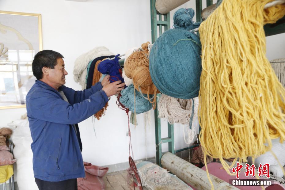 在青海省湟中縣加牙村加牙藏族織毯技藝傳習(xí)所內(nèi),青海加牙藏毯第七代傳人楊永良在織房內(nèi)整理已染好色的羊毛線。中新社記者 馬銘言 攝