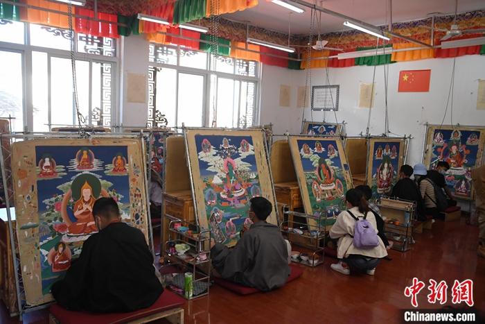 6月中旬,唐卡畫(huà)技能班里的學(xué)生們正在完成自己的畢業(yè)作品。中新社記者 劉忠俊 攝