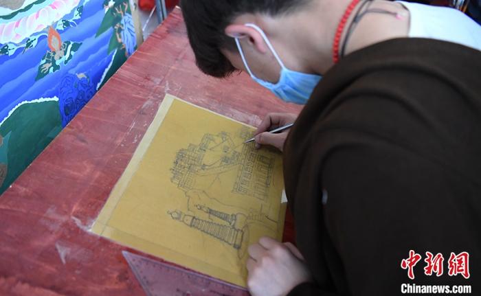6月中旬,唐卡畫(huà)初級(jí)班里一名學(xué)生正在進(jìn)行唐卡畫(huà)素描練習(xí)。中新社記者 劉忠俊 攝