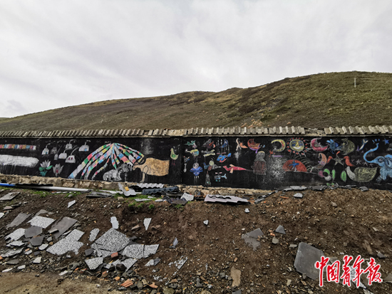 學(xué)校里有一面墻,現(xiàn)代文明的痕跡與傳統(tǒng)游牧的習(xí)俗,被學(xué)生們畫(huà)在了一起。畫(huà)上有五彩經(jīng)幡、雪山羊群,有絢麗的格?;ê蜏嘏臍址?,以及穿著藏袍大笑的孩子。畫(huà)上還有直升飛機(jī)、火箭和飛碟。