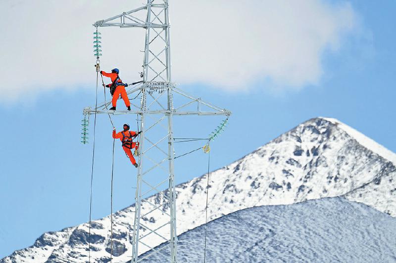 5月17日,雪后初霽。在理塘—下壩35千伏線路工程施工現(xiàn)場(chǎng),架線人員踩著厚厚的積雪進(jìn)行展線施工。