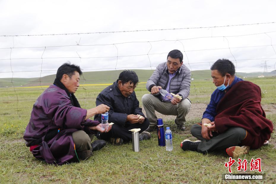 7月21日,青海省海北藏族自治州剛察縣伊克烏蘭鄉(xiāng)剛察貢麻村的索南木旦巴(左一)、仁增才讓(左二)、吉科加(右二)、萬瑪扎西(右一)四人在撿拾著草場垃圾途中,吃餅子,喝礦泉水充饑。2008年,萬瑪扎西路在村支書的支持下,與索南木旦巴、仁增才讓、吉科加三個人組建了義務環(huán)保隊,自此一干就是12年。他們在撿拾垃圾的同時進行著環(huán)保宣傳,希望從源頭減少垃圾。仁增才讓說:“現(xiàn)在草原上的垃圾幾乎是看不到了。”中新社記者 馬銘言 攝