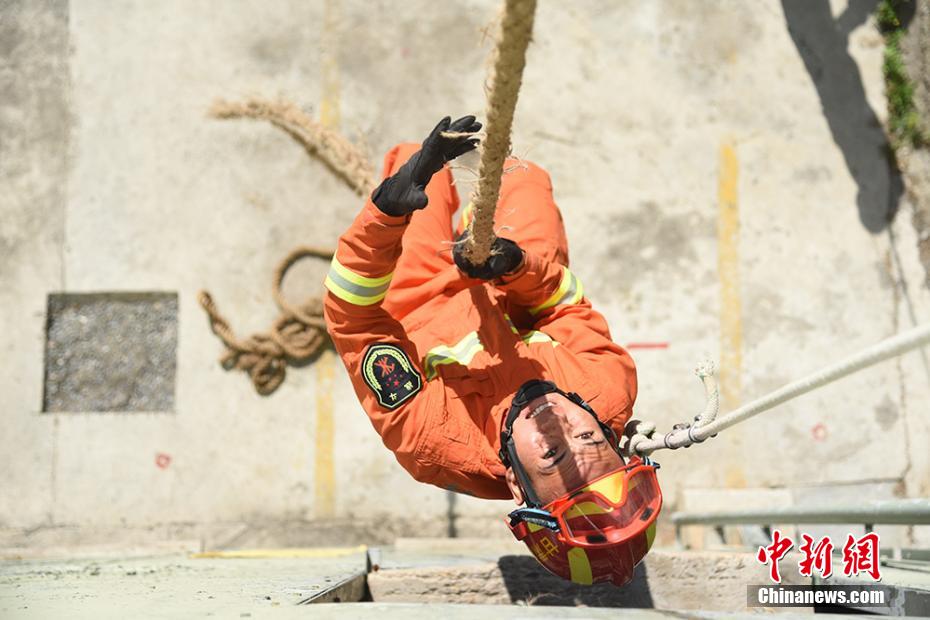 圖為消防員摩拳擦掌,迎難而戰(zhàn),創(chuàng)造了單杠卷身上的新紀(jì)錄。 婁淵燾 攝