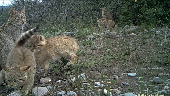 荒漠貓為中國所有貓科動物中僅有的特有物種,《世界自然保護聯盟》(IUCN)瀕危(EN)物種,荒漠貓在全國數量稀少,分布密度低,對其生活史所知甚少。其通常棲息于海拔2500米至5000米干燥的高山與亞高山灌叢、戈壁、草甸生境中。自祁連山國家公園青海省管理局啟動荒漠貓專項調查以來,在國家公園范圍內頻繁記錄到荒漠貓活動畫面,并且記錄到一只雌性荒漠貓成功撫育4只幼崽的畫面,監(jiān)測到5只荒漠貓同框的罕見畫面。祁連山國家公園青海片區(qū)自開展貓科動物專項調查以來,記錄到5只雪豹同框、6只兔猻同框的罕見畫面后又一次記錄到貓科動物多只同框的畫面。