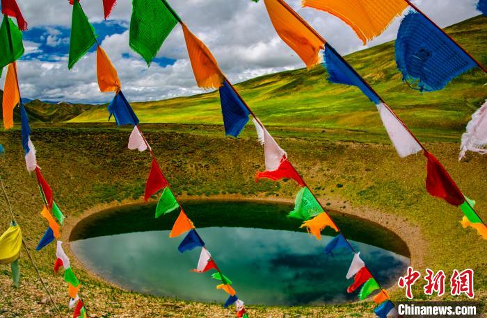 圖為經(jīng)幡下的碧綠湖水。功霸扎西達(dá)杰 攝