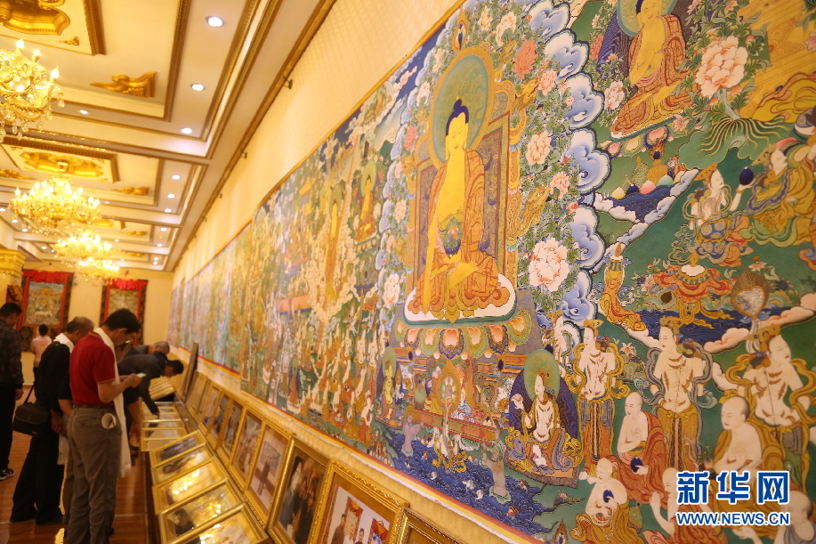 在龍樹(shù)花苑的展示大廳,游客正在觀(guān)賞展出的唐卡作品。新華網(wǎng) 卡婭梅朵攝