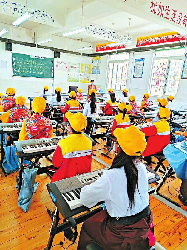 甘孜州理塘縣城關第四完全小學音樂室,孩子們正在學習彈奏電子琴。張庭銘 攝
