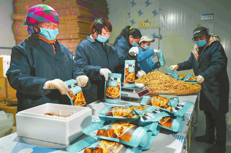 在涼山州木里縣藏祥閣農(nóng)特產(chǎn)品商貿(mào)有限公司,工人們正在熟練地為核桃裝袋。近年來,通過電商銷售,木里的農(nóng)特產(chǎn)品成為網(wǎng)上暢銷商品,既為農(nóng)民脫貧、增收開拓了新路,又滿足了現(xiàn)代人對農(nóng)村原生態(tài)農(nóng)產(chǎn)品的消費需求。尹鋼 攝(資料圖片)