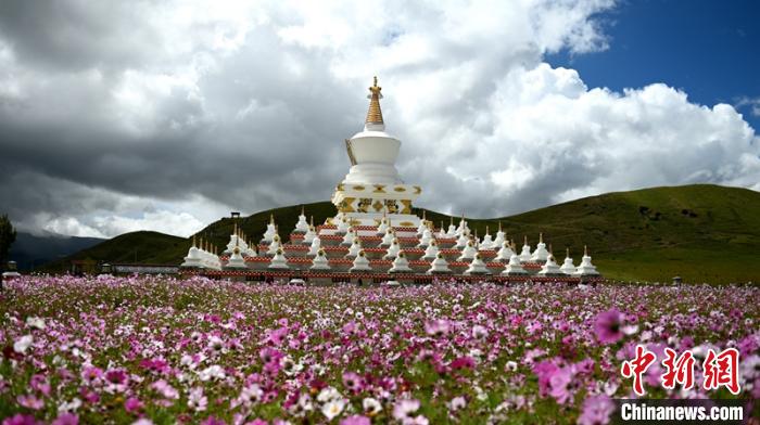 9月9日,四川省甘孜藏族自治州稻城縣金珠濕地公園一望無際的格桑花海姹紫嫣紅,過往車輛和游客們紛紛下車,走進濕地公園用手機直播和拍照留念。