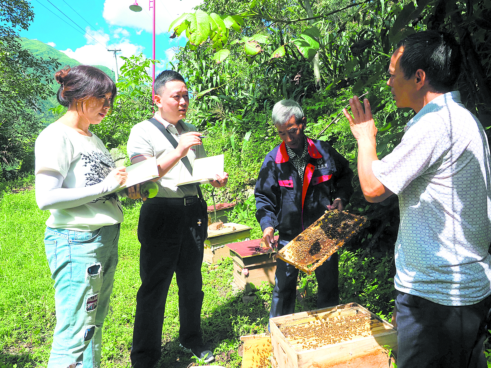 回轉(zhuǎn)身去,蒲江縣對口援助瀘定工作隊隊長吳孟賢正和張洪彬攀談著今年的蜜蜂增收情況?!捌呀h新增財政幫扶資金277萬元作為獎補資金,激勵成都三千米甜蜂業(yè)有限公司落戶瀘定發(fā)展的‘貢嘎中蜂’養(yǎng)殖支援項目,現(xiàn)在已經(jīng)累計發(fā)放貢嘎中蜂7500余群,幫助全縣38個貧困村發(fā)展村級集體經(jīng)濟(jì),示范帶動800戶以上貧困戶增收?!眳敲腺t滔滔不絕如數(shù)家珍,身旁飛過的貢嘎中蜂也似乎成了他和其他對口支援隊員的化身,他們從舒適的成都平原來到高原瀘定,懷揣堅定的信念,用行動肩負(fù)起責(zé)任與擔(dān)當(dāng),他們將藏族同胞的利益裝在心里、舉過頭頂,排除千難萬險,因地制宜推動當(dāng)?shù)匕l(fā)展;跋山涉水,進(jìn)居入戶,訪貧問苦,為藏族同胞送上溫暖與關(guān)懷……他們用心血和汗水書寫著一個大大的“愛”字,甜到藏族同胞的心坎上。