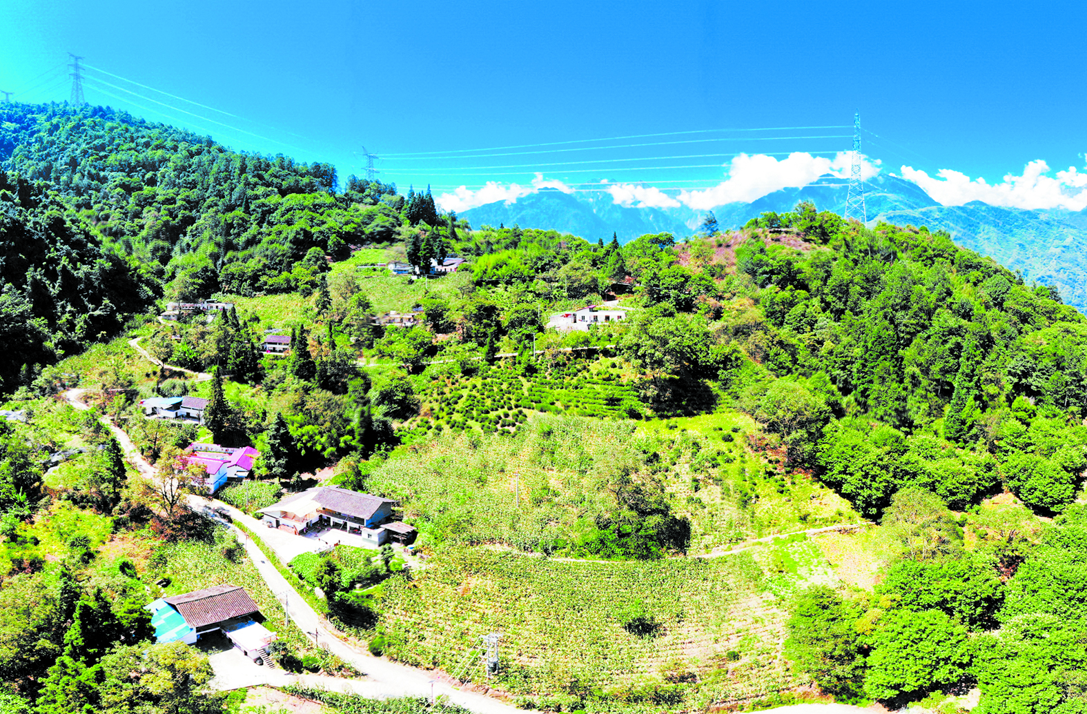 從奔騰的大渡河谷一路向上,海拔1800多米的甘孜州瀘定縣得妥鎮(zhèn)紫雅場村,樹林連綿成片,山頂云霧繚繞,山坡上的茶園反射著陽光,在藍(lán)天的映襯下格外青翠。