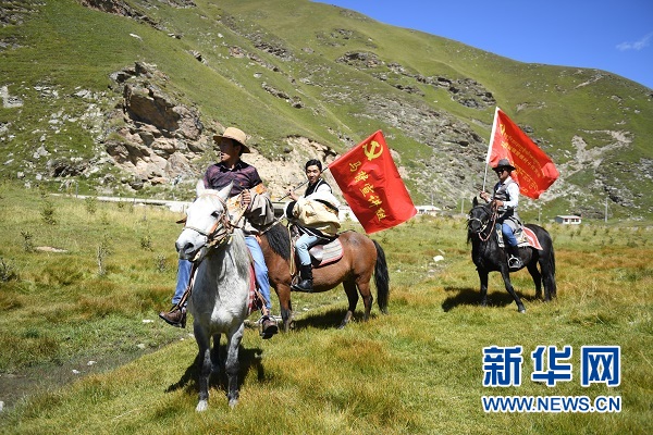 瑪沁縣拉加鎮(zhèn)贊根村的“馬背宣傳隊(duì)”。新華網(wǎng) 潘彬彬 攝
