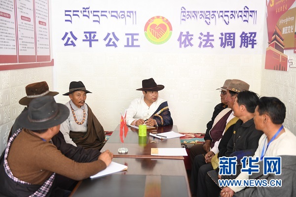 “官卻個人調(diào)解工作室”(中為官卻)為當(dāng)?shù)厝罕娬{(diào)解矛盾糾紛。新華網(wǎng) 潘彬彬 攝