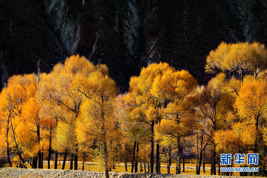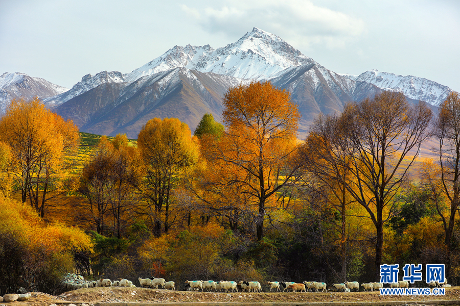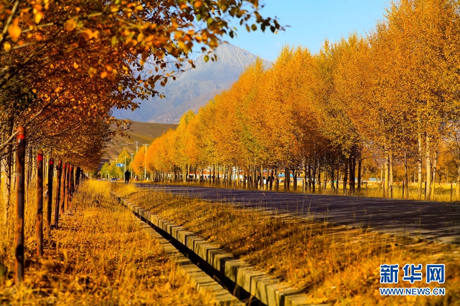 金黃色的樹木與遠(yuǎn)山交相輝映,處處呈現(xiàn)出醉人的美景。新華網(wǎng) 蘇金元 攝