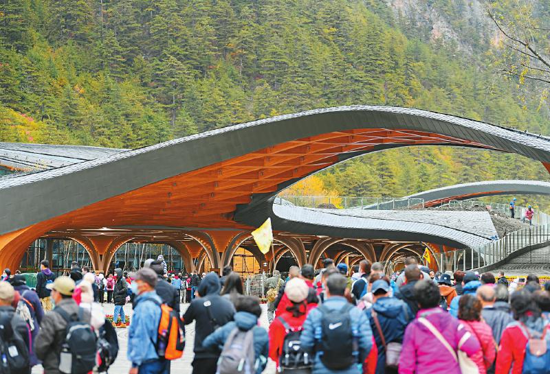 以景推城。在九寨溝,處處可見“生態(tài)優(yōu)先”的痕跡——生態(tài)擋墻間的動物通道,游客腳下的生態(tài)棧道、景區(qū)外的旅游環(huán)保法庭……