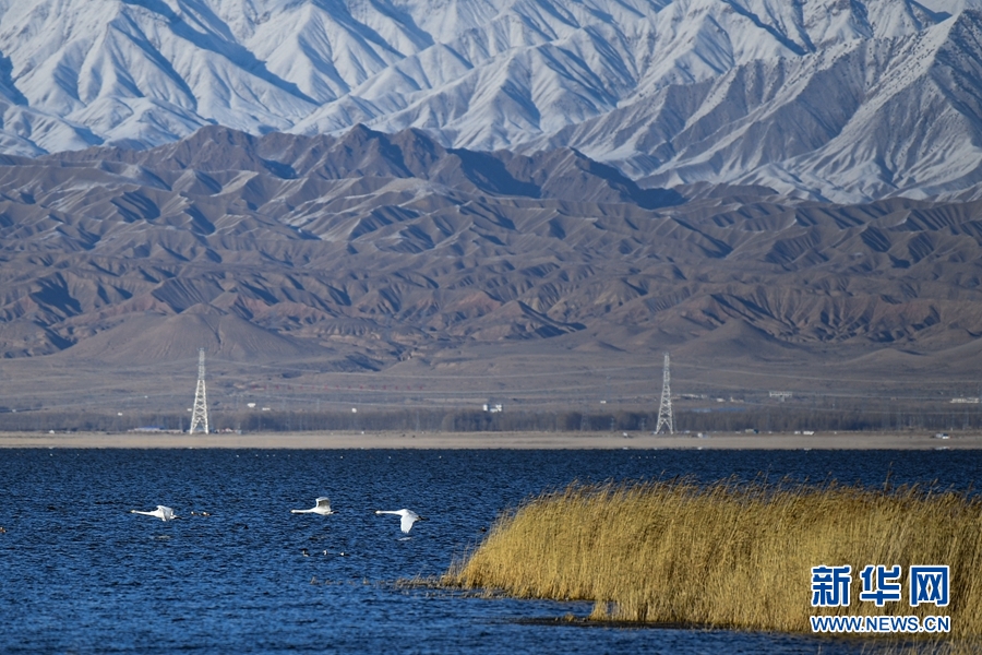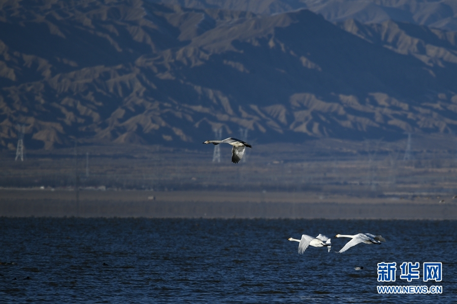 大天鵝、赤麻鴨在都蘭湖游弋。(11月21日攝) 新華網 潘彬彬 攝