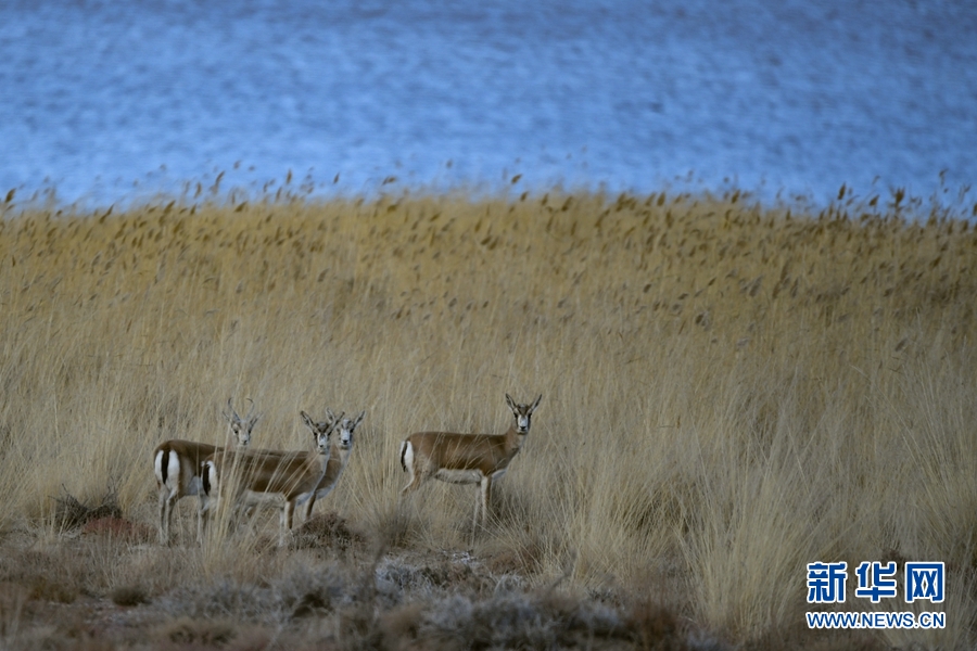 四只鵝喉羚在都蘭湖國家濕地公園內活動。(11月21日攝)新華網 潘彬彬 攝