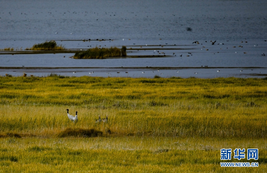 生活在都蘭湖國家濕地公園內的黑頸鶴一家。(9月24日攝)新華網 潘彬彬 攝