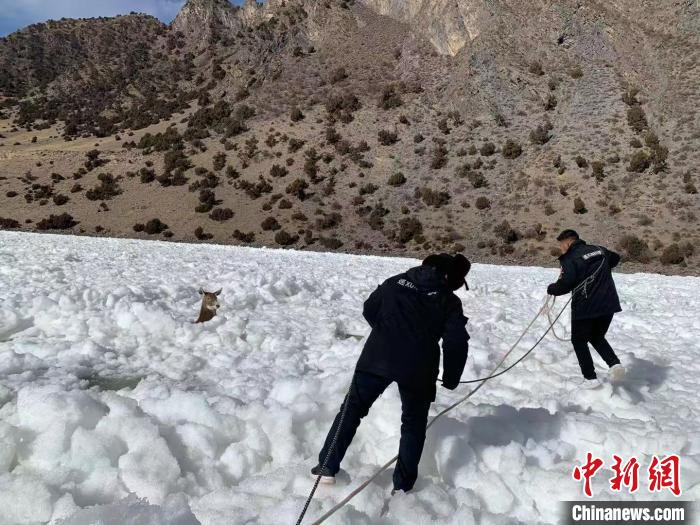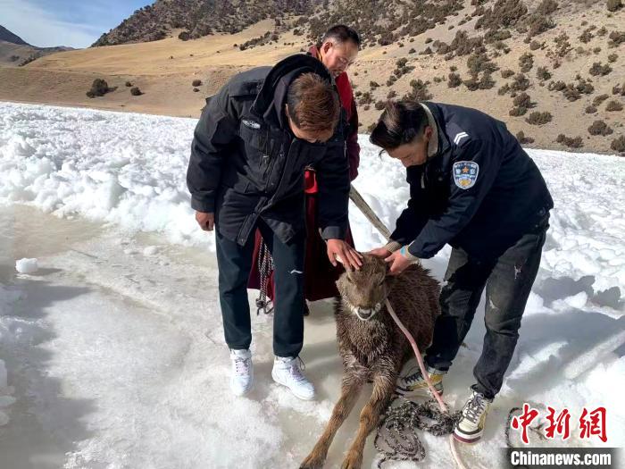青海生態(tài)保護(hù)人員營救被困長江源冰面一級保護(hù)動物白唇鹿