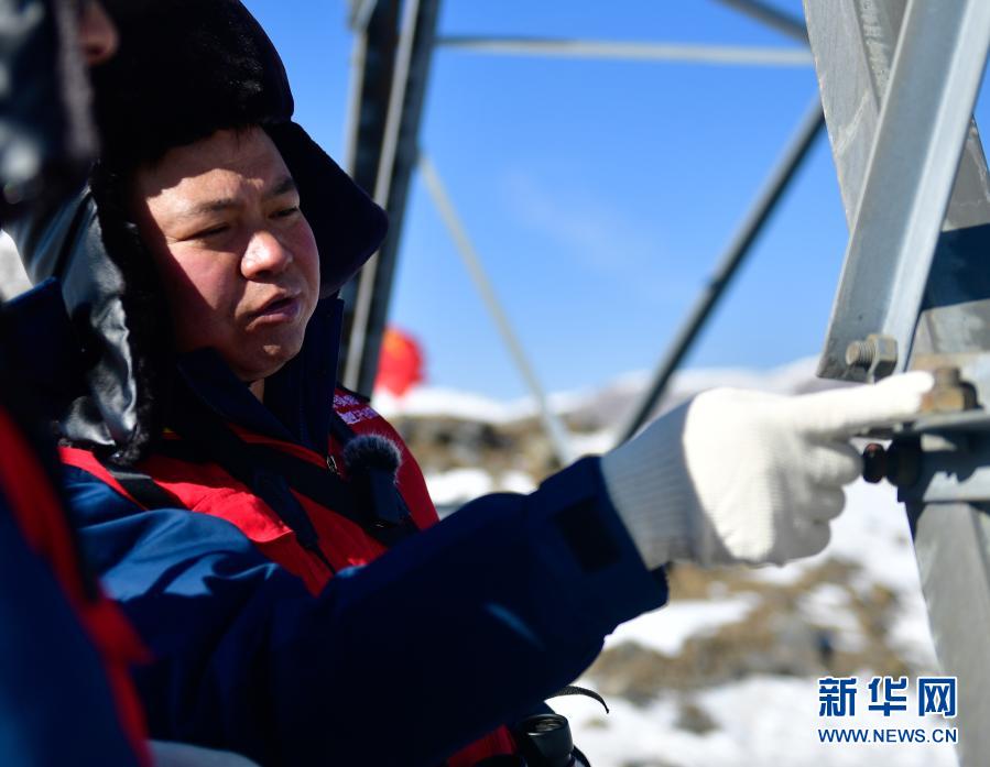 1月21日,國家電網(wǎng)西寧供電公司輸電運(yùn)檢中心運(yùn)檢人員董進(jìn)軍在測量線路耐張線夾溫度。新華社記者 張龍 攝