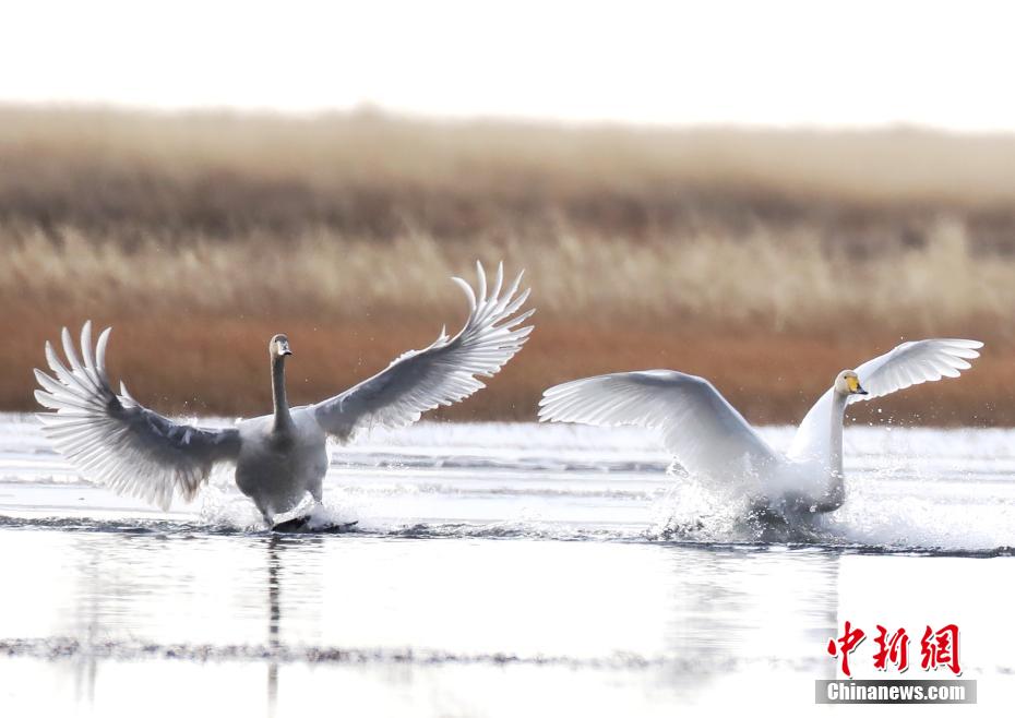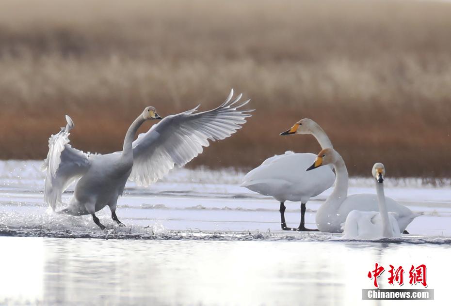 連日來,成群的野生大天鵝陸續(xù)飛臨四川省阿壩藏族羌族自治州若爾蓋縣高原小鎮(zhèn)麥溪鄉(xiāng)的洛賈瓊果河棲息越冬。這些跨越千里來此越冬的精靈讓洛賈瓊果河充滿了童話色彩,近百只天鵝在偌大的湖面上自由自在地覓食嬉戲,一會兒在天空翱翔,一會兒又成群結(jié)隊地在湖面上追逐,時而淺吟低唱,時而引吭高歌,時而振翅高飛,愜意十足,為冰封雪凍的高原濕地增添了些許靈動與生機,成為草原冰雪世界一道靚麗的風(fēng)景。