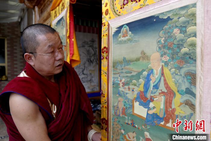 圖為印巴尖措畫唐卡。張?zhí)砀!z