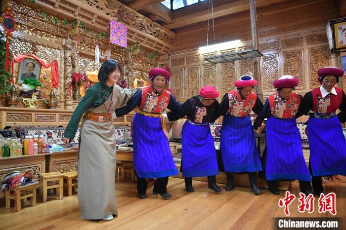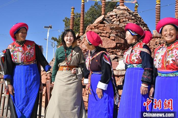 圖為穿上藏裝的格桑卓瑪(左二)在村里與長(zhǎng)輩們聊天。中新社記者 劉冉陽(yáng) 攝