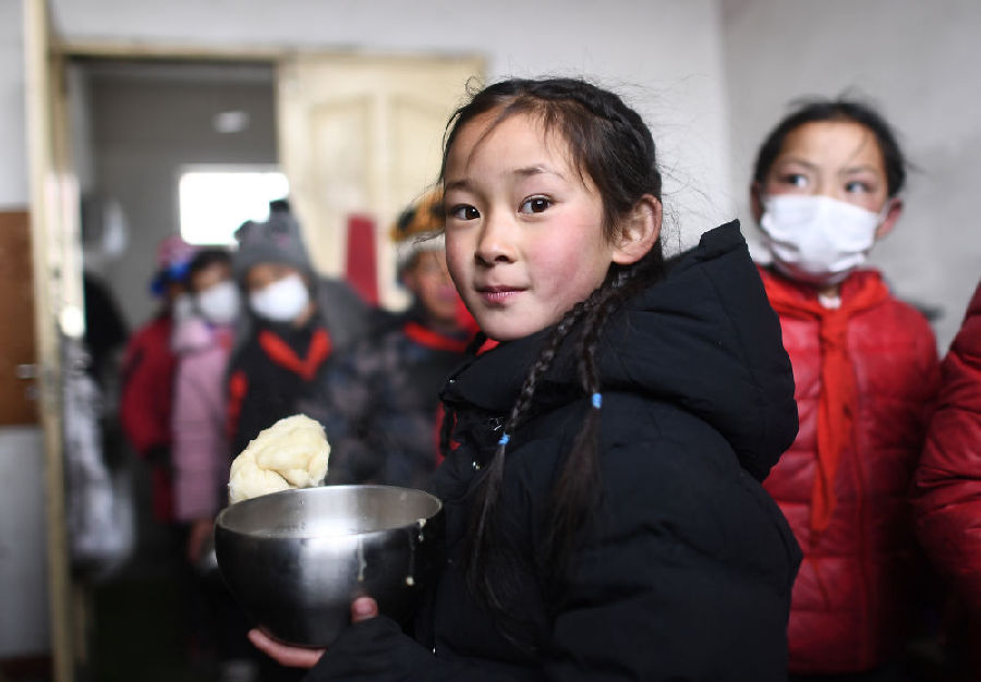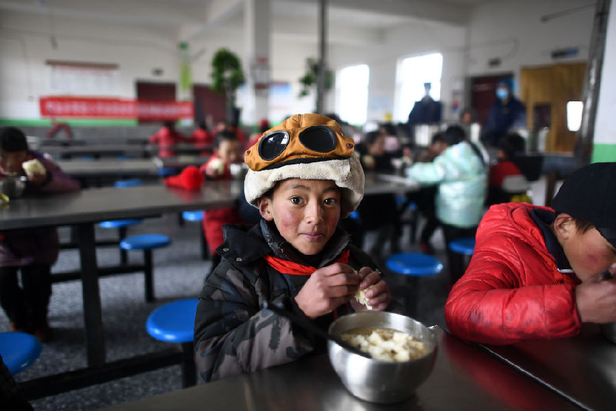 3月16日,在索加鄉(xiāng)寄宿小學食堂,格來達杰(前)在吃晚餐。新華社記者 韓方方 攝