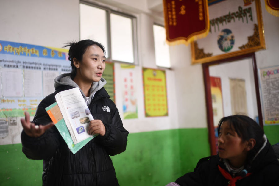 3月16日,索加鄉(xiāng)寄宿小學藏語文老師白瑪在為學生授課。新華社記者 韓方方 攝