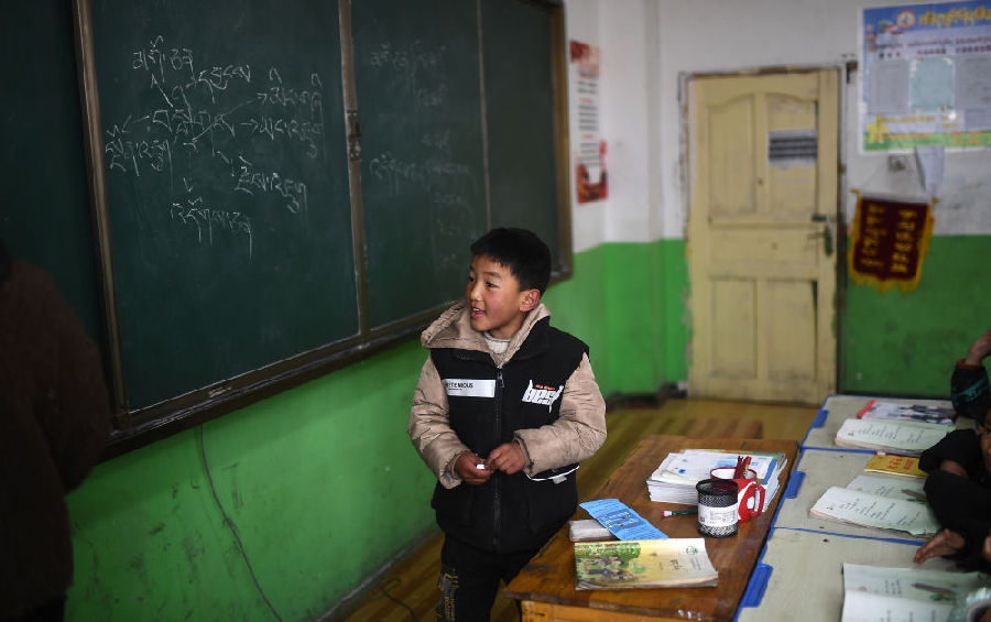 3月16日,索加鄉(xiāng)寄宿小學語文老師查日在為學生上課。新華社記者 張宏祥 攝