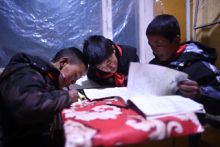 3月16日,在索加鄉(xiāng)寄宿小學,羅松東丁(中)和小伙伴在宿舍內溫習功課。新華社記者 張宏祥 攝