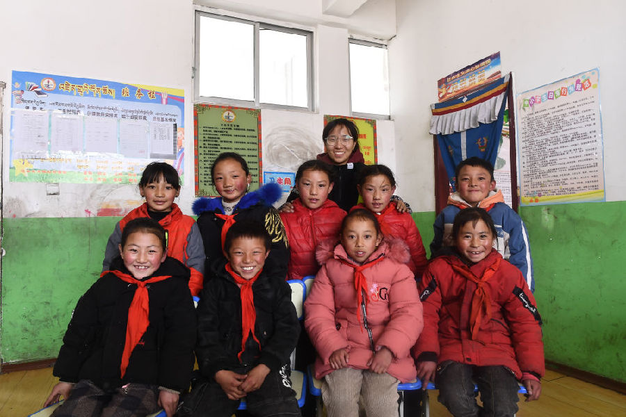 3月16日,在索加鄉(xiāng)寄宿小學,查日老師(后排中)和學生在一起。新華社記者 駱曉飛 攝