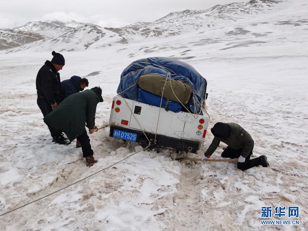 2020年3月,袁廣明(右一)和巡山隊(duì)員一起在可可西里巡山途中解困被陷車輛。新華社發(fā)