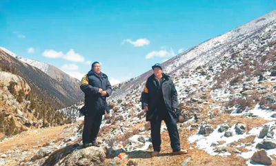 圖為生態(tài)管護人員徒步抵達巡護目的地。丁巴達杰 攝