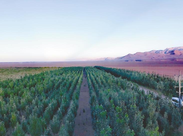 跟隨柴達木防沙治沙公司員工深一腳、淺一腳地走在治沙基地田埂上,一排排在田間地頭栽植的林木,為農(nóng)田和枸杞林構(gòu)成了一道道擋風墻。雖然眼下林木尚在發(fā)芽,到了夏秋時節(jié)就是滿目蔥郁。