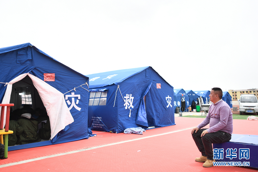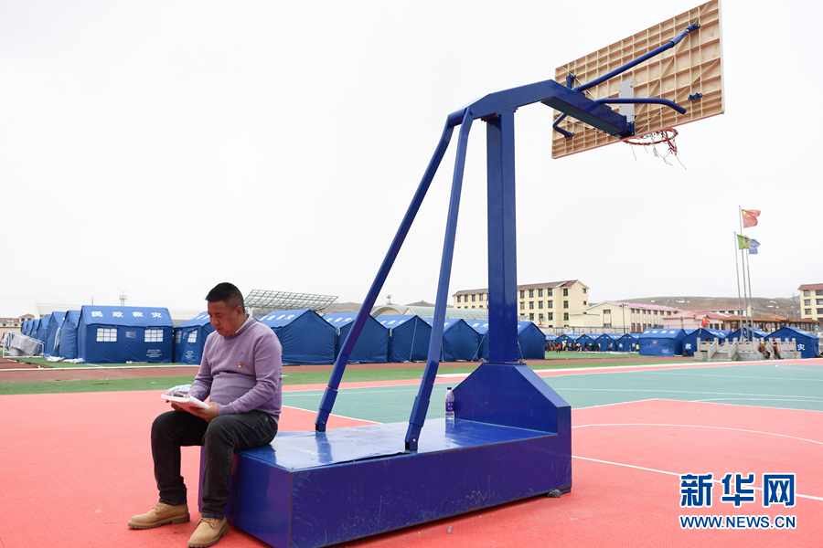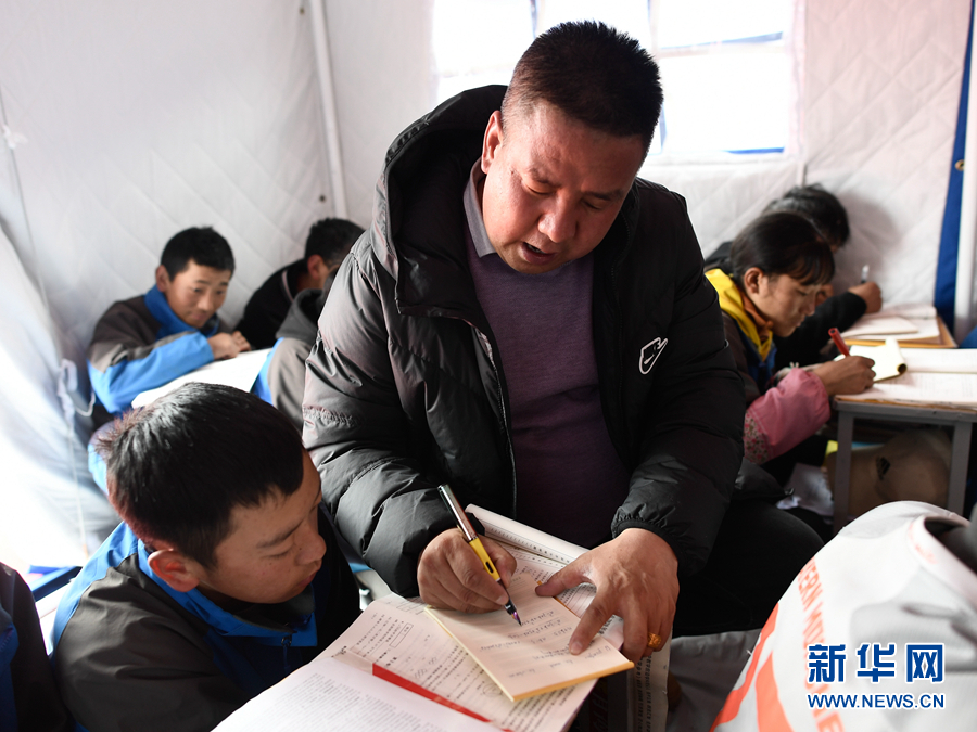 5月23日,李加才讓在帳篷教室里給學(xué)生輔導(dǎo)功課。新華社記者 張龍 攝