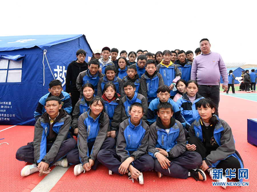 5月23日,李加才讓和學(xué)生們在瑪多縣民族寄宿制中學(xué)帳篷教室旁合影。新華社記者 張龍 攝