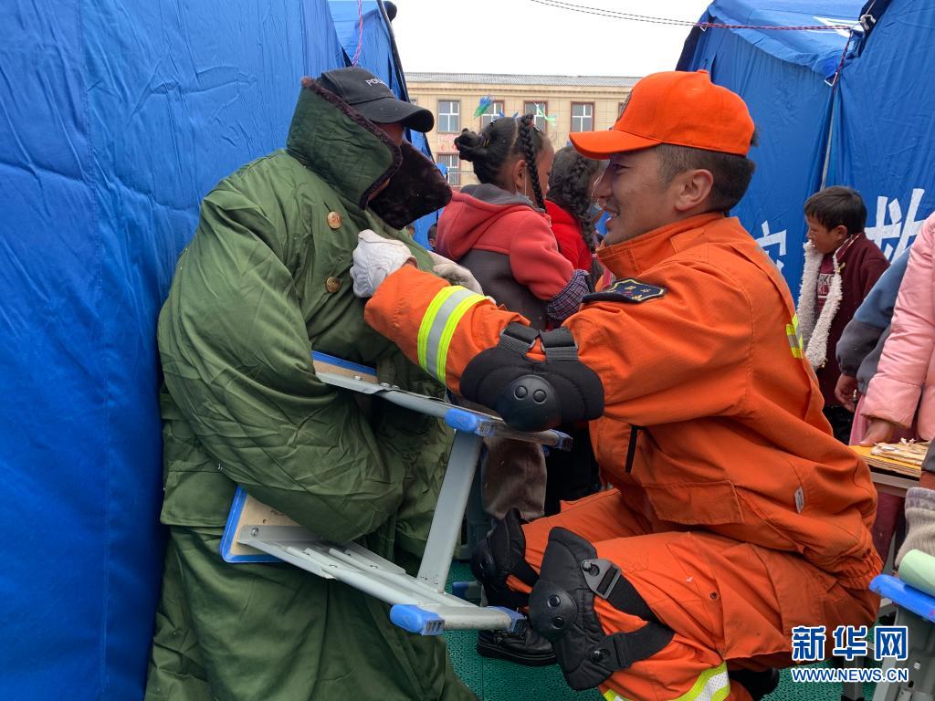 22日,地震發(fā)生后,群英尕丁來到安置區(qū)搭建帳篷和消防排查,12歲的班瑪華桑就與身穿橙色制服的群英尕丁結下了兄弟情誼。“我們是一輩子的兄弟,這幾天你也要照顧好自己?!比河㈡囟⌒χ鴩诟腊喱斎A桑。