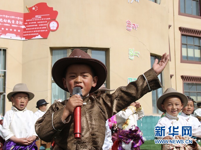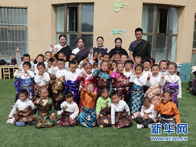 穿上藏袍唱歌舞蹈,6歲的扎西納木甲第一次在幼兒園與38名同學(xué)一起過了“六一”兒童節(jié)。笑聲從貢巴幼兒園傳出,飄向校門外的青青草原。
