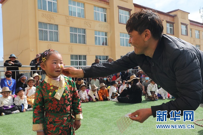 今年的“六一”活動上,貢巴幼兒園的小朋友們表演了藏族歌舞、《三字經(jīng)》朗誦等精彩節(jié)目。小男孩們穿上藏袍、戴上氈帽,活潑地跳起鍋莊。小女孩們盛裝打扮,頭上用彩色頭繩編滿了小辮兒,腰間特色銀飾叮當(dāng)作響。親子互動游戲笑聲不斷,欄桿外的老阿媽看得興致盎然。