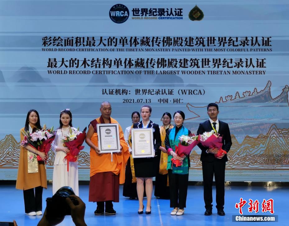 7月13日,青海省黃南藏族自治州同仁市麻巴寺新修建的扎西多卡瑪?shù)?3日正式落成,并被世界紀(jì)錄認(rèn)證機(jī)構(gòu)(WRCA)認(rèn)證為彩繪面積最大的單體藏傳佛殿建筑和最大的木結(jié)構(gòu)單體藏傳佛殿建筑。據(jù)悉,新修建的扎西多卡瑪?shù)睿ㄗ诳Π偷睿﹥?nèi)外均以礦石原料和植物原料手工彩繪,面積為5883.48平方米,該殿被確認(rèn)為“世界彩繪面積最大的單體藏傳佛殿建筑”,該殿主體為木制結(jié)構(gòu)的重檐歇山頂式建筑,占地面積為540余平方米,長27米、寬21米、高16米,共三層,該殿被確認(rèn)為“世界最大的木結(jié)構(gòu)單體藏傳佛殿建筑”。