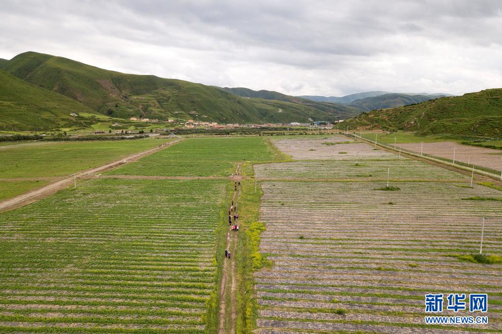 7月17日,壤塘縣瑟谷村農(nóng)牧民進(jìn)入蔬菜基地勞作(無人機(jī)照片)。新華社記者 李鑫 攝