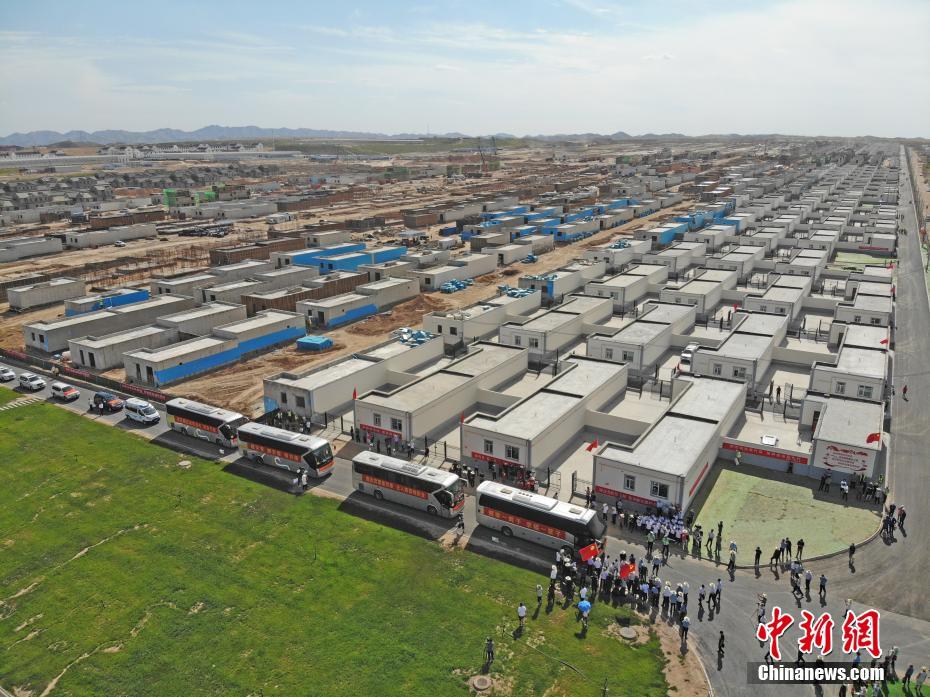8月7日,甘肅省舟曲縣首批60戶289名地質(zhì)災(zāi)害避險搬遷村民到達(dá)蘭州新區(qū)并入住。甘肅舟曲縣啟動地質(zhì)災(zāi)害避險搬遷工作,第一批次60戶289人集中告別故土,乘車前往數(shù)百公里之外的蘭州新區(qū)。(無人機(jī)拍攝) 中新社記者 楊艷敏 攝