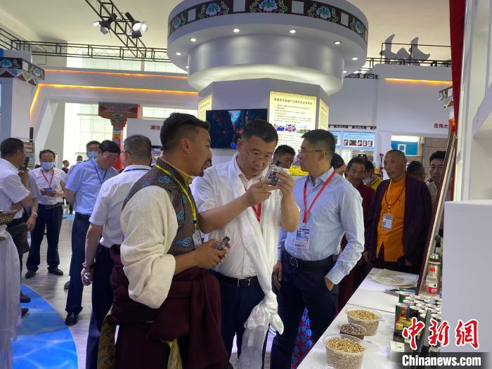 圖為在第22屆青洽會(huì)上,拉東才索南帶來了黑青稞酒、面等產(chǎn)品。受訪者供圖