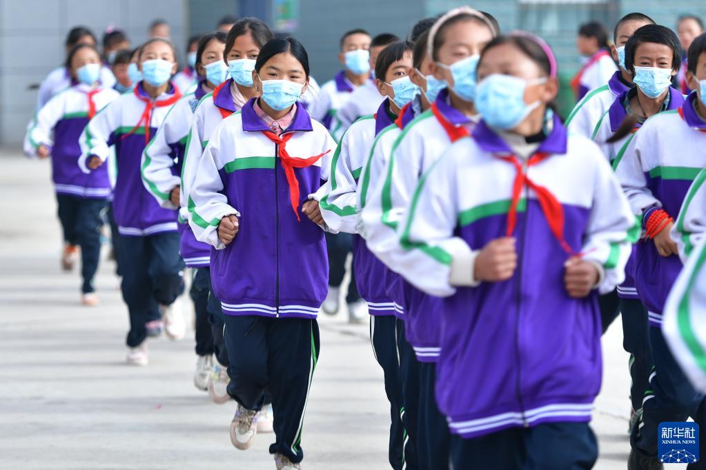 9月1日,在位于果洛藏族自治州瑪沁縣的瑪多地震災(zāi)后過渡安置一校區(qū),學(xué)生在跑步。新華社記者 張龍 攝